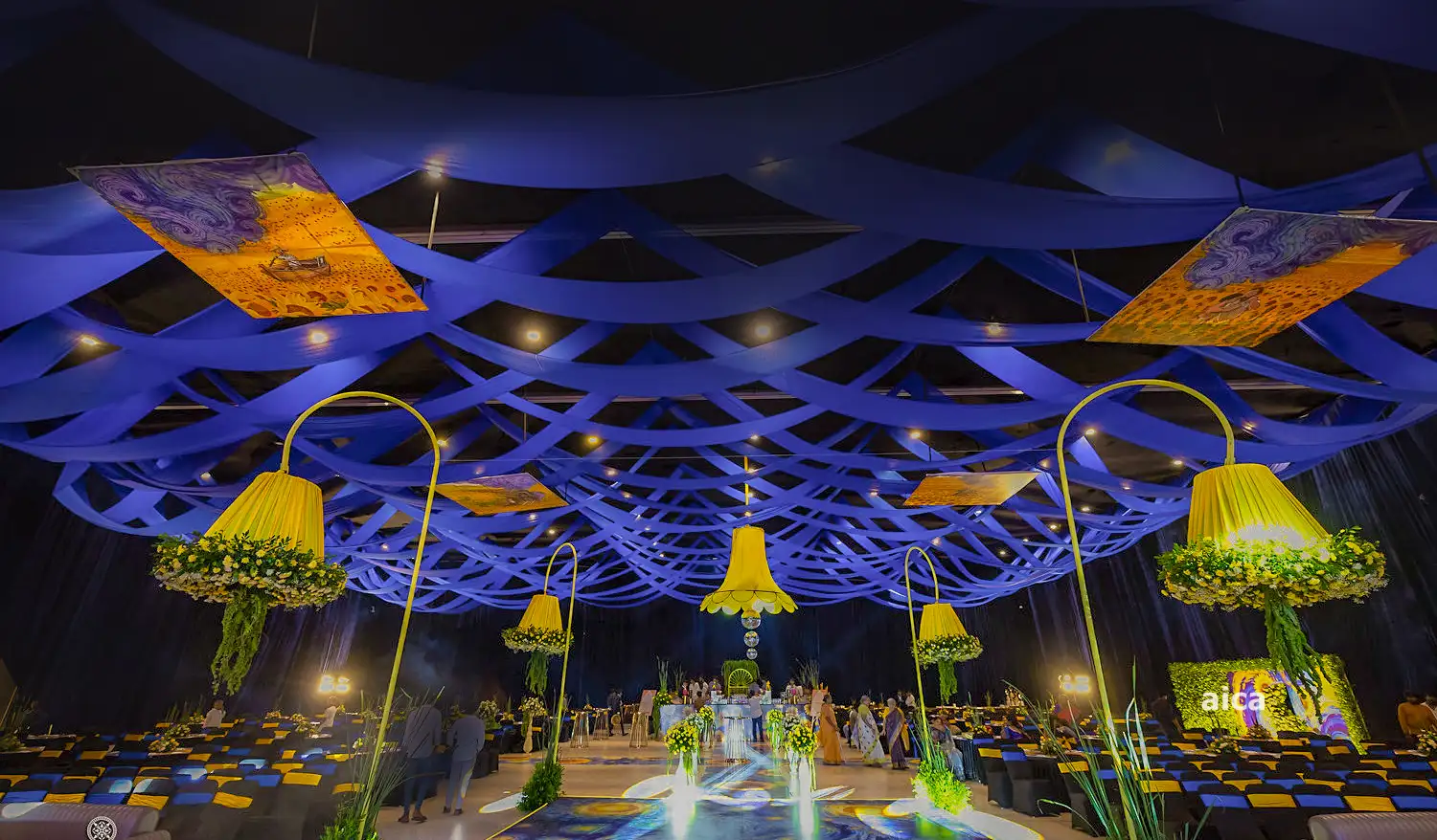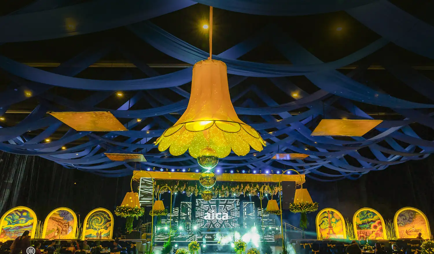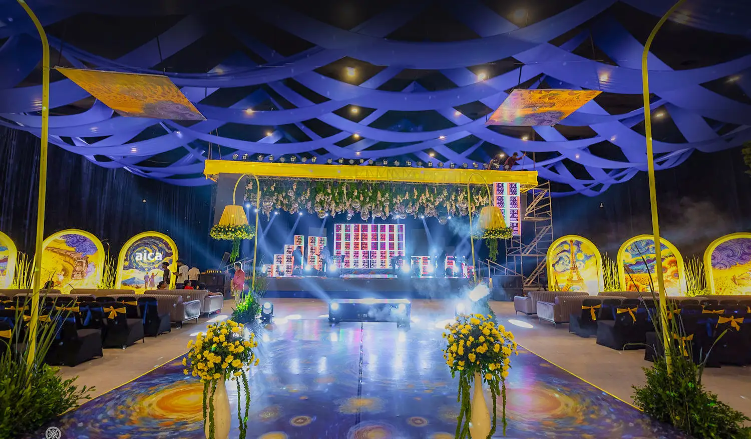 The Van Gogh’s Starry Splendor theme is a high-energy, ultra-modern celebration setup that infuses every moment with the pulse of lights and sound. With a dazzling LED stage that mimics a futuristic skyline and a dance floor wrapped in dynamic reflections, this decor screams party perfection. Vivid yellow beams pierce through the venue from intelligent moving lights, creating a concert-like aura while crystal chandeliers above add a glamorous contrast. Black chair covers tied with golden bows add elegance, perfectly grounding the otherwise electric ambiance. Ideal for sangeet nights, receptions, or birthday bashes, this theme promises an unforgettable evening where the rhythm, color, and joy never fade.