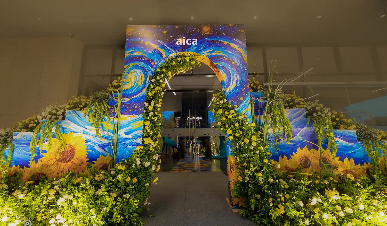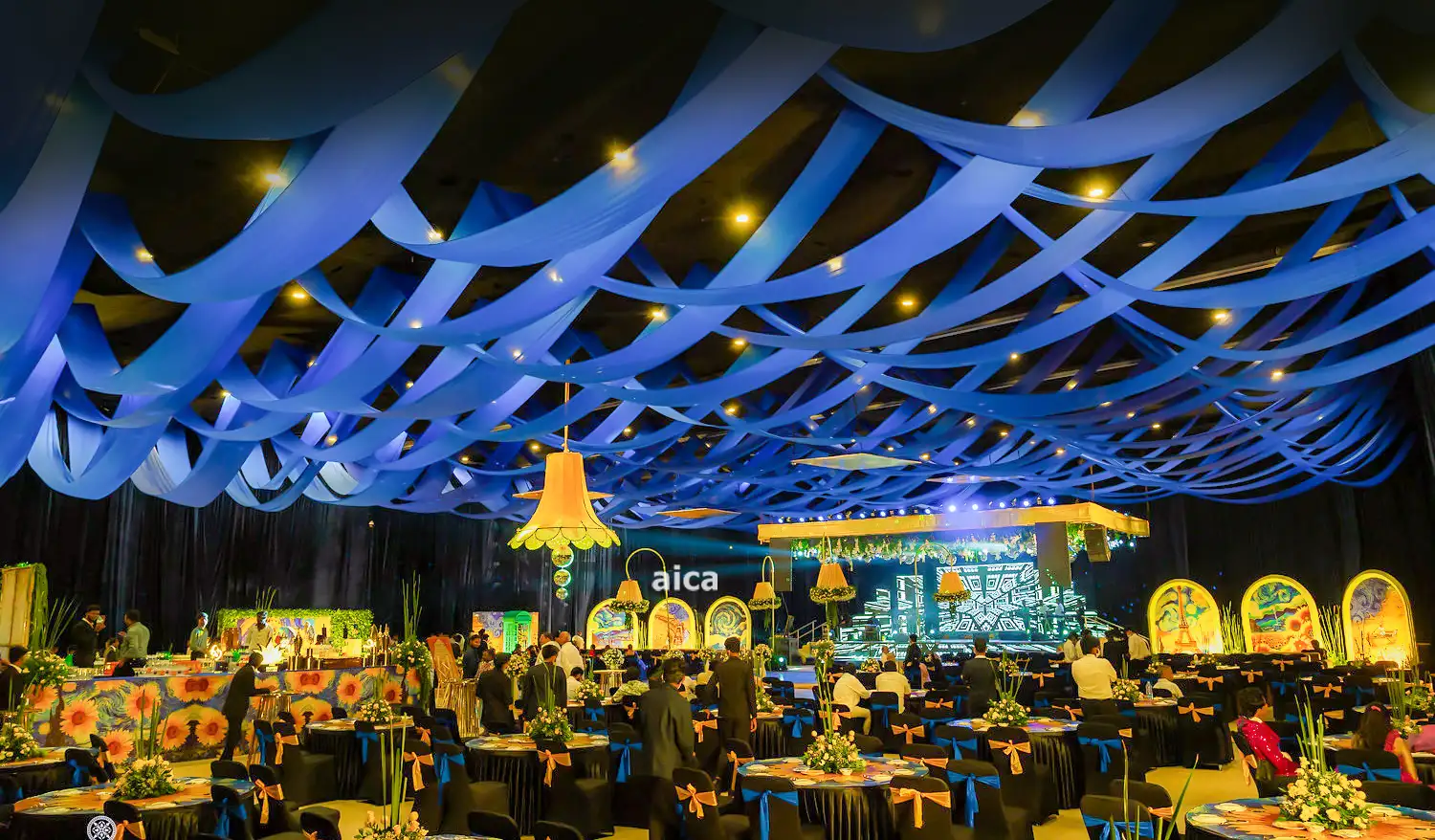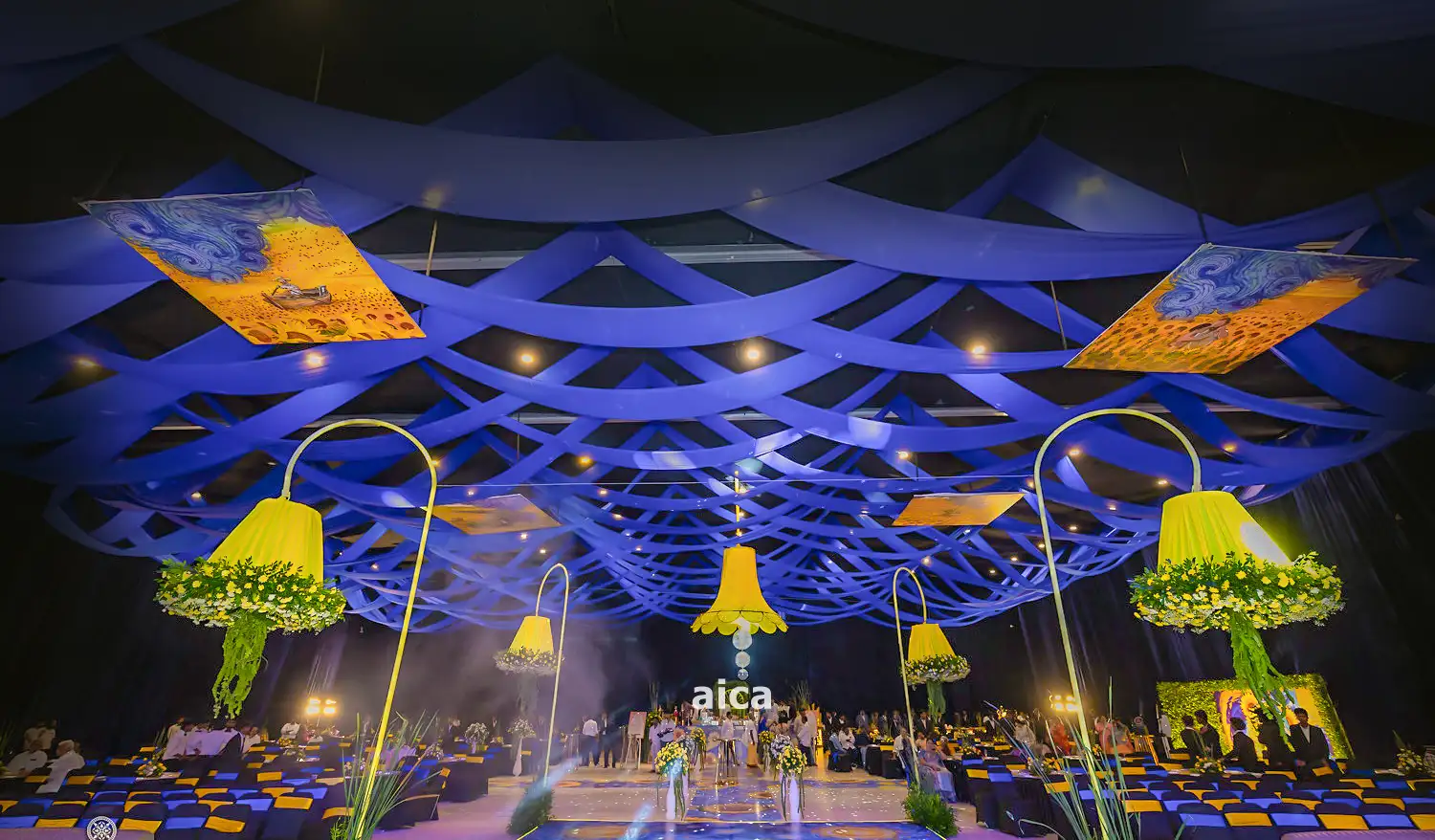 The Van Gogh’s Starry Splendor theme is a high-energy, ultra-modern celebration setup that infuses every moment with the pulse of lights and sound. With a dazzling LED stage that mimics a futuristic skyline and a dance floor wrapped in dynamic reflections, this decor screams party perfection. Vivid yellow beams pierce through the venue from intelligent moving lights, creating a concert-like aura while crystal chandeliers above add a glamorous contrast. Black chair covers tied with golden bows add elegance, perfectly grounding the otherwise electric ambiance. Ideal for sangeet nights, receptions, or birthday bashes, this theme promises an unforgettable evening where the rhythm, color, and joy never fade.