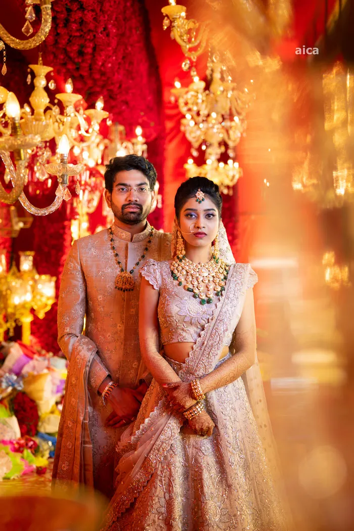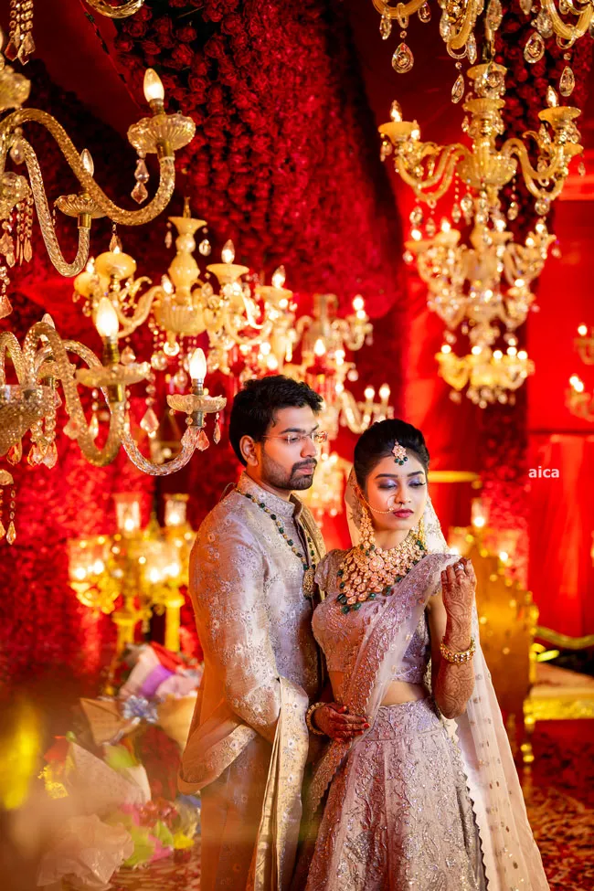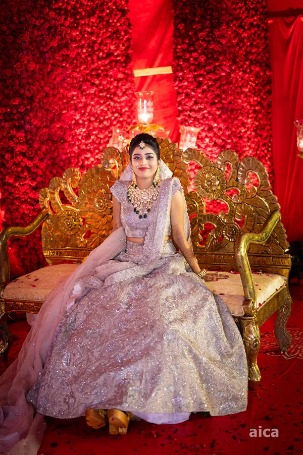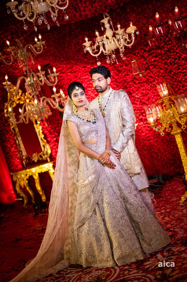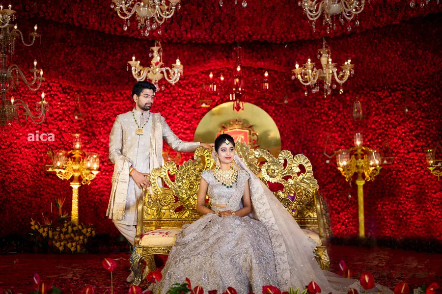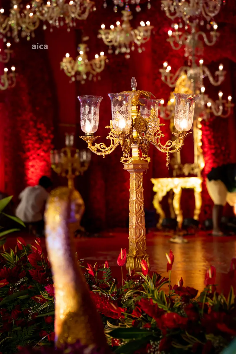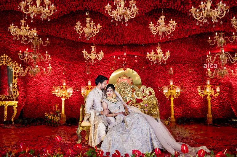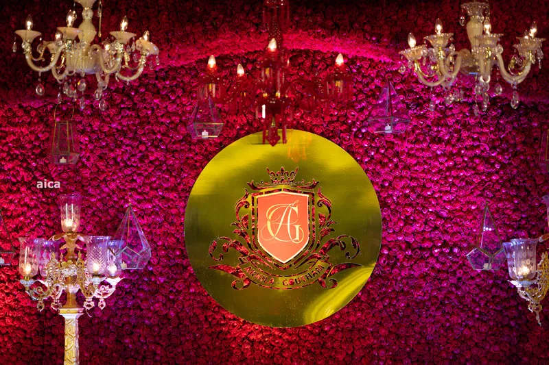 Aica team did this wedding–reception stage rendered almost entirely in deep crimson blooms and gilded accents. A full-width “flower wall” of tightly packed red roses undulates in soft wave-patterns across the back, bathed in warm uplighting. Dozens of crystal chandeliers hang at staggered heights, their golden fixtures twinkling. At center is a circular gold-leaf medallion bearing a decorative monogram. On either side, ornate gold mirrors stand atop matching filigree pedestals. In the foreground, lush floor-level clusters of red roses, dahlias and anthuriums spill forward, punctuated by white lilies and spray roses, woven through with eucalyptus and ivy.