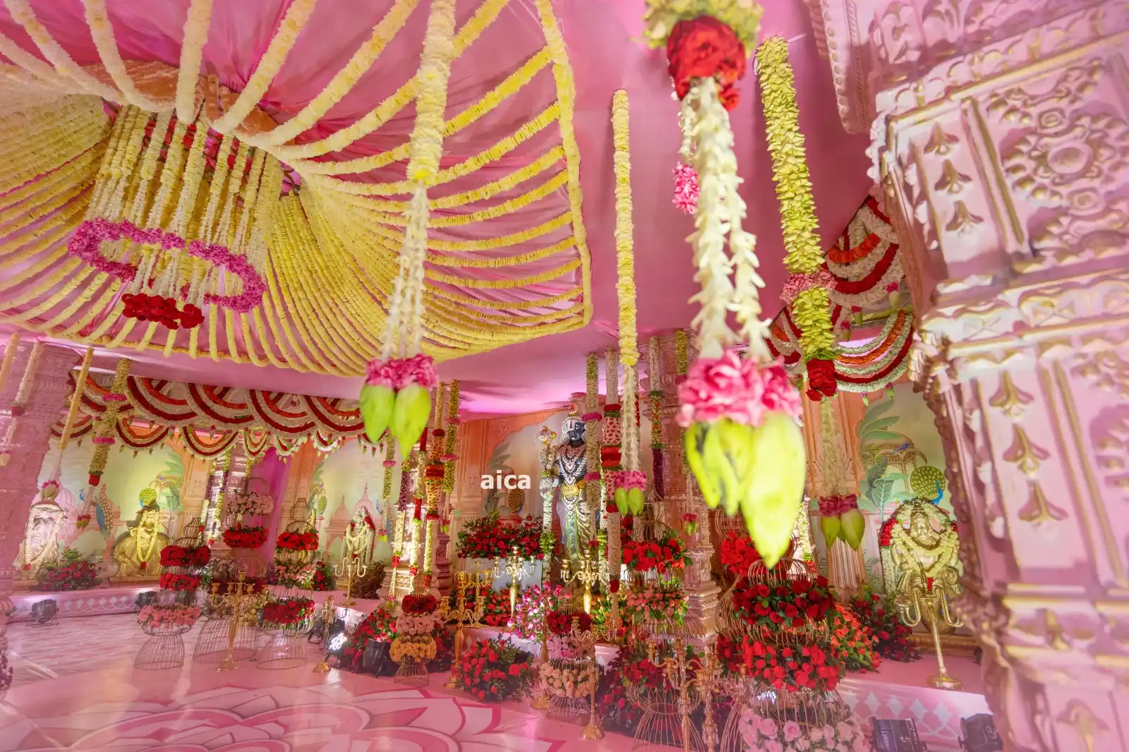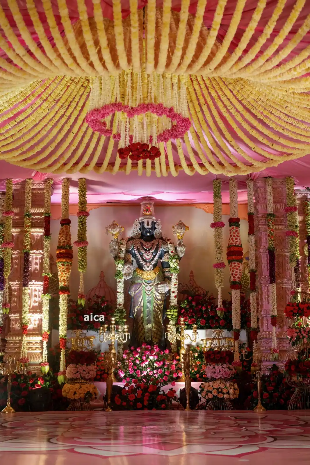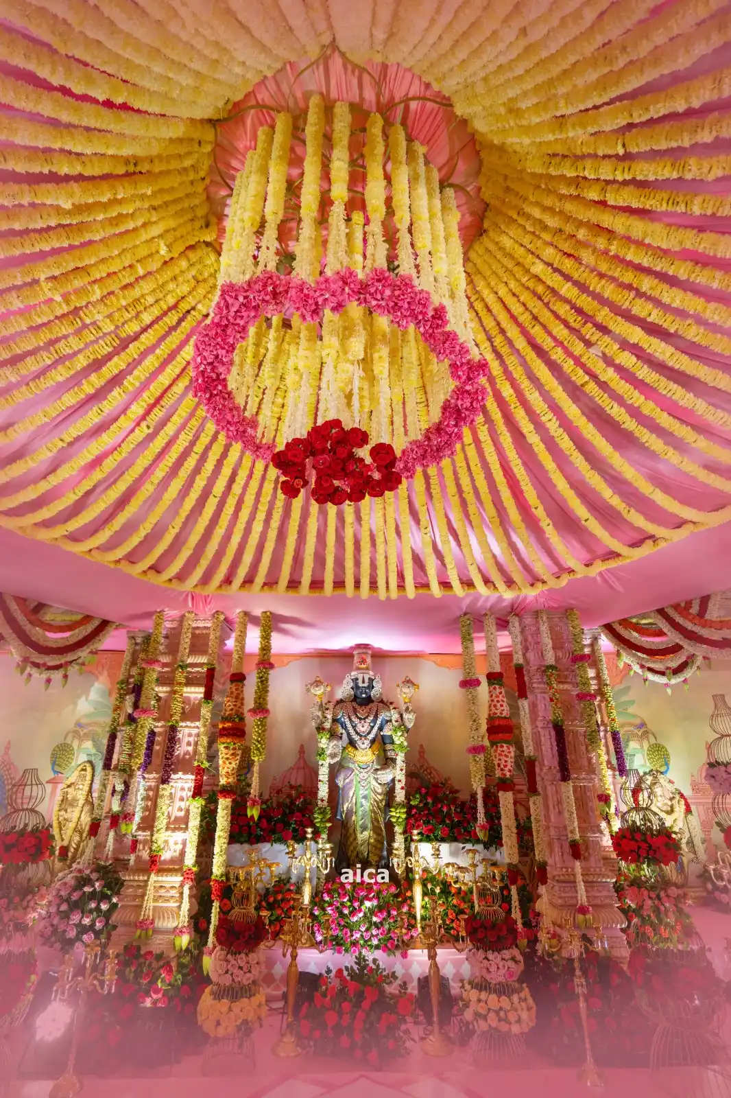 This stunning floral setup is a blend of traditional elegance and divine ambiance, perfect for temple ceremonies, weddings, and spiritual functions. The golden-yellow floral canopy crowned with a heart-shaped ring of roses adds a heavenly touch to the entire decor. The main deity is surrounded by pillars adorned with vertical garlands and a bed of roses, creating a sacred and majestic atmosphere.