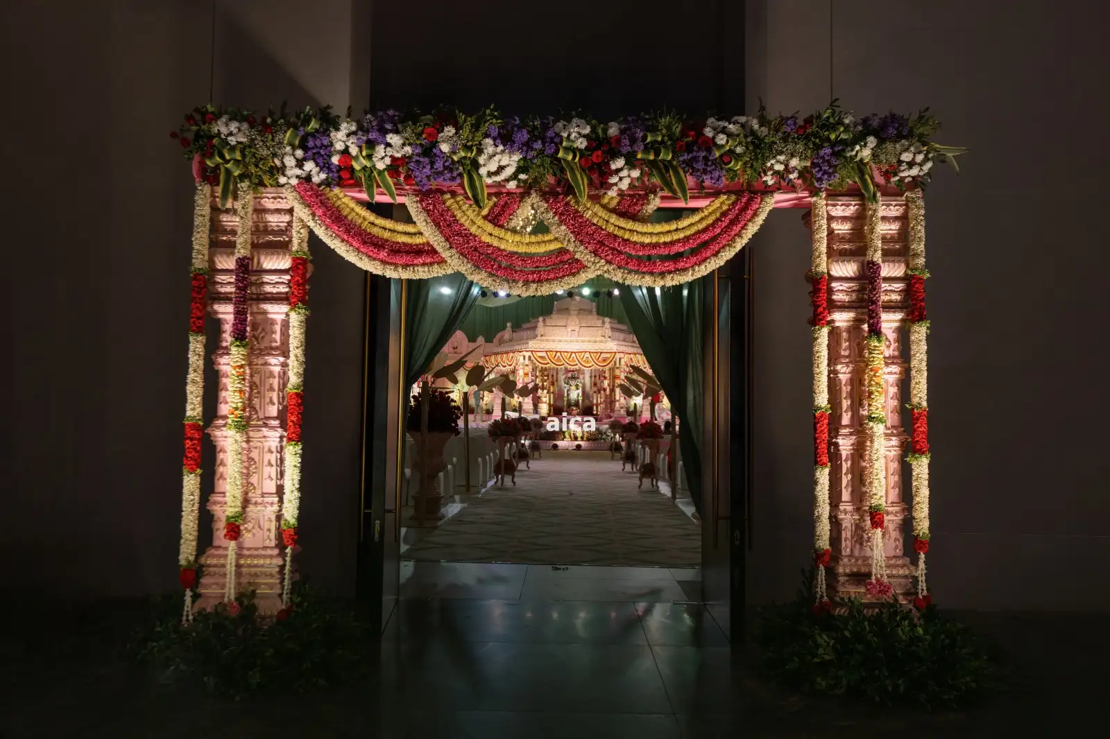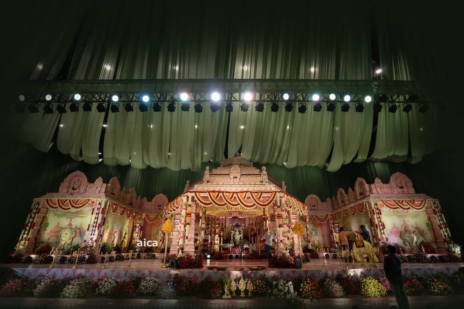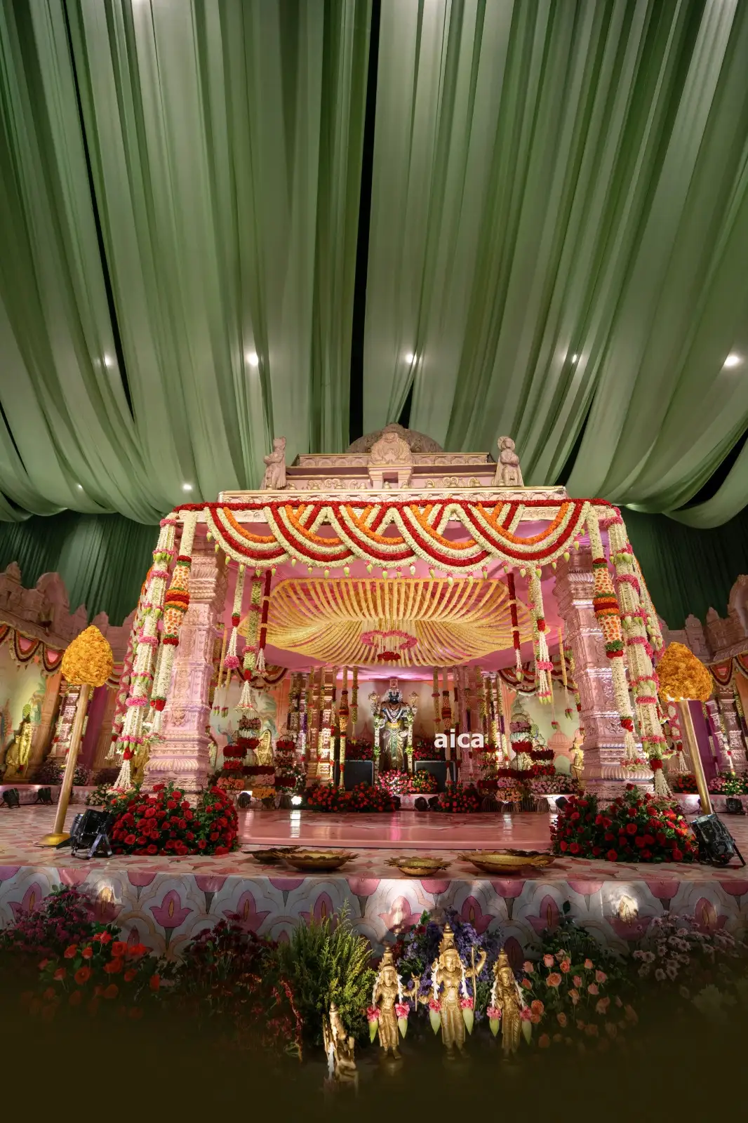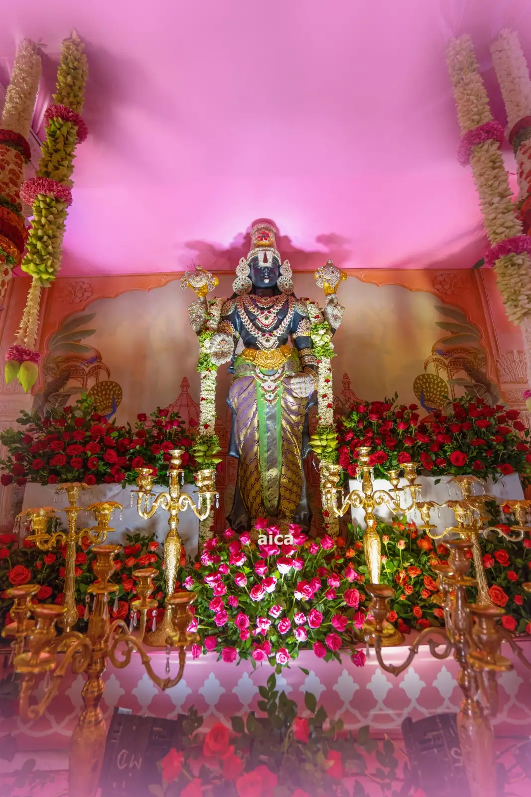 This stunning floral setup is a blend of traditional elegance and divine ambiance, perfect for temple ceremonies, weddings, and spiritual functions. The golden-yellow floral canopy crowned with a heart-shaped ring of roses adds a heavenly touch to the entire decor. The main deity is surrounded by pillars adorned with vertical garlands and a bed of roses, creating a sacred and majestic atmosphere.
